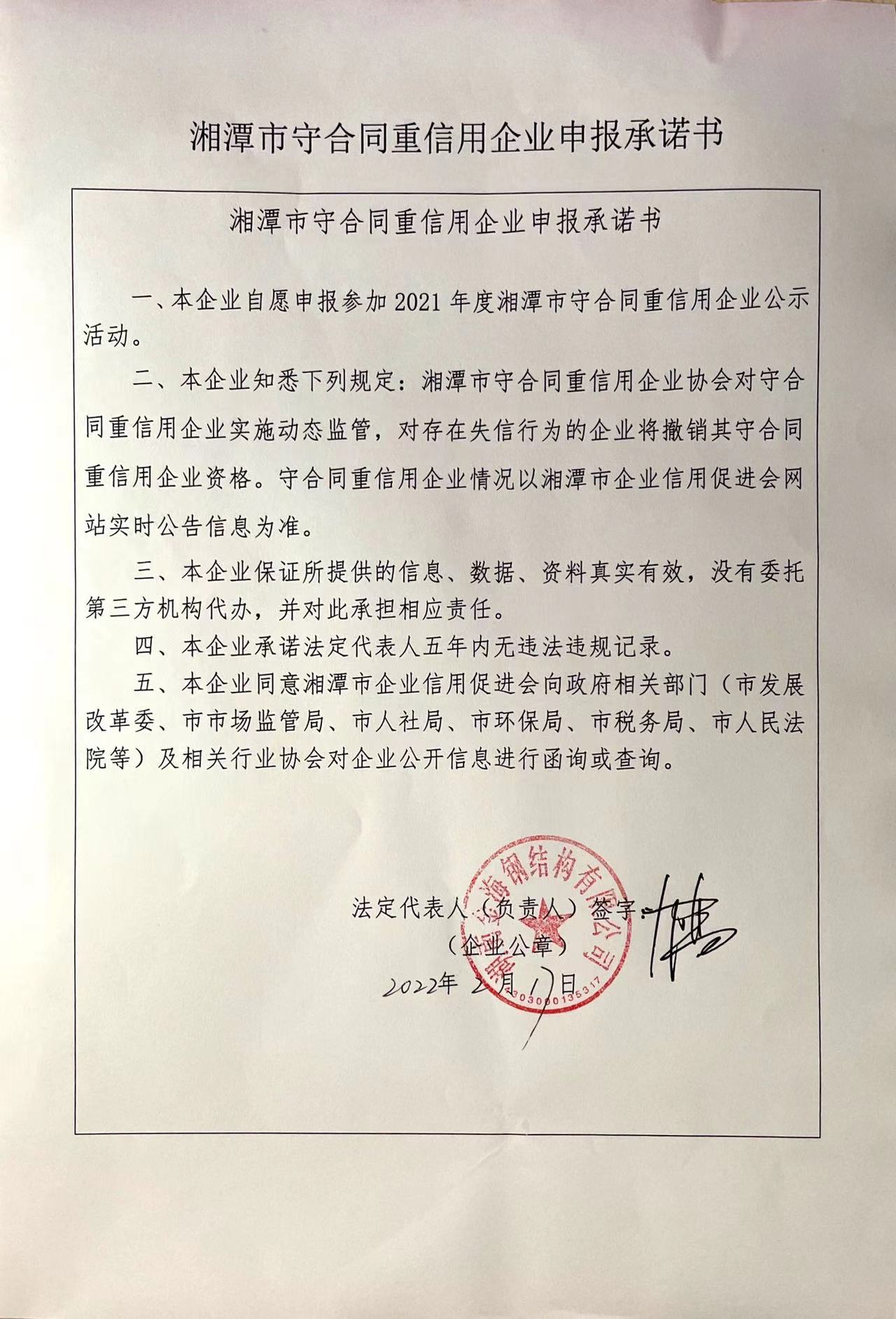 本企業(yè)根據(jù)《湘潭市守合同重信用企業(yè)申報(bào)規(guī)定》等編制 2021 年度企業(yè)信用報(bào)告書(shū),并保證本報(bào)告書(shū)內(nèi)容真實(shí)、準(zhǔn)確、完整。