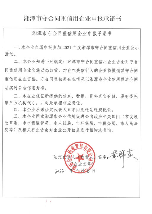 本企業(yè)根據《湘潭市守合同重信用企業(yè)申報規(guī)定》等編制 2021 年度企業(yè)信用報告書,并保證本報告書內容真實、準確、完整。