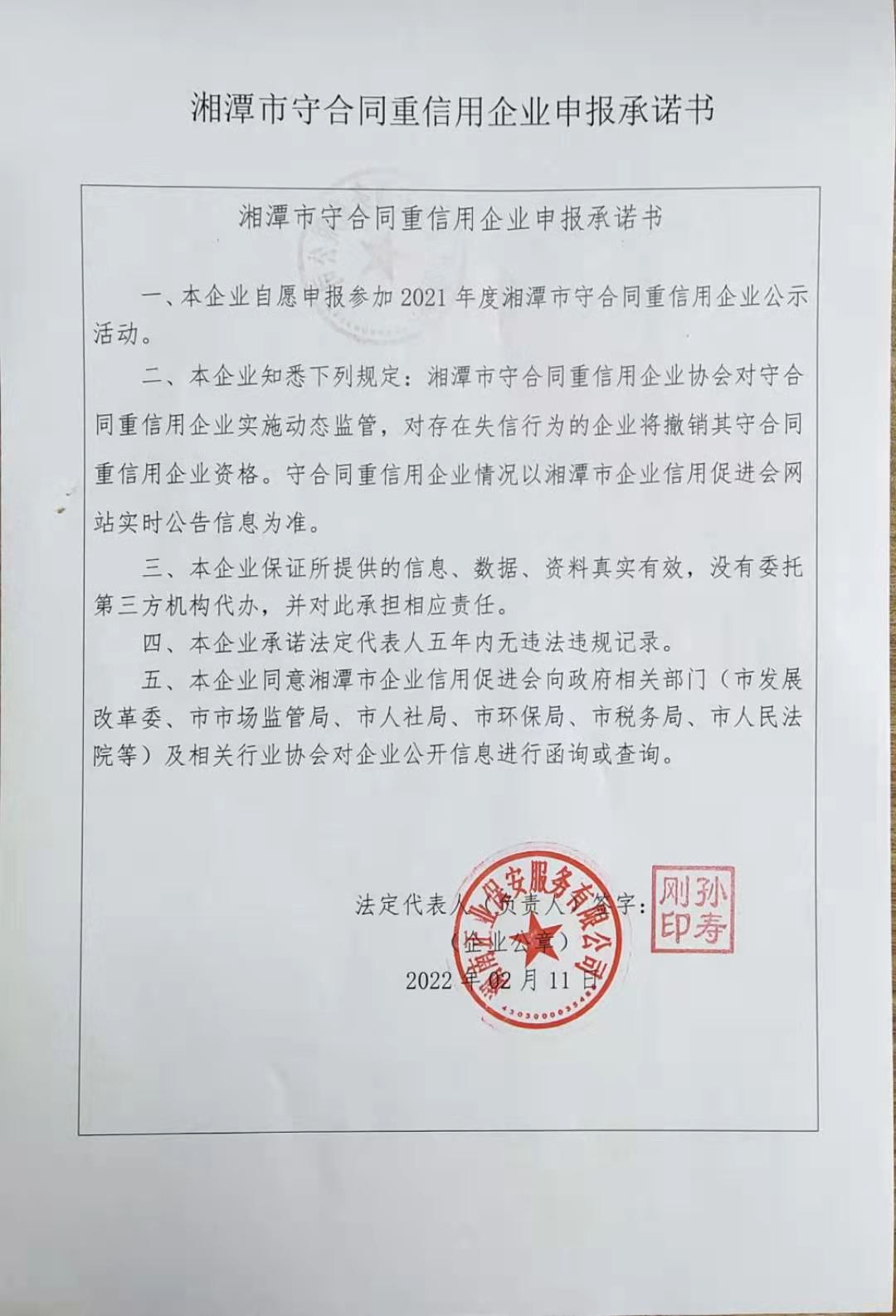 本企業(yè)根據(jù)《湘潭市守合同重信用企業(yè)申報規(guī)定》等編制 2021年度 年度企業(yè)信用報告書,并保證本報告書內(nèi)容真實、準(zhǔn)確、完整。