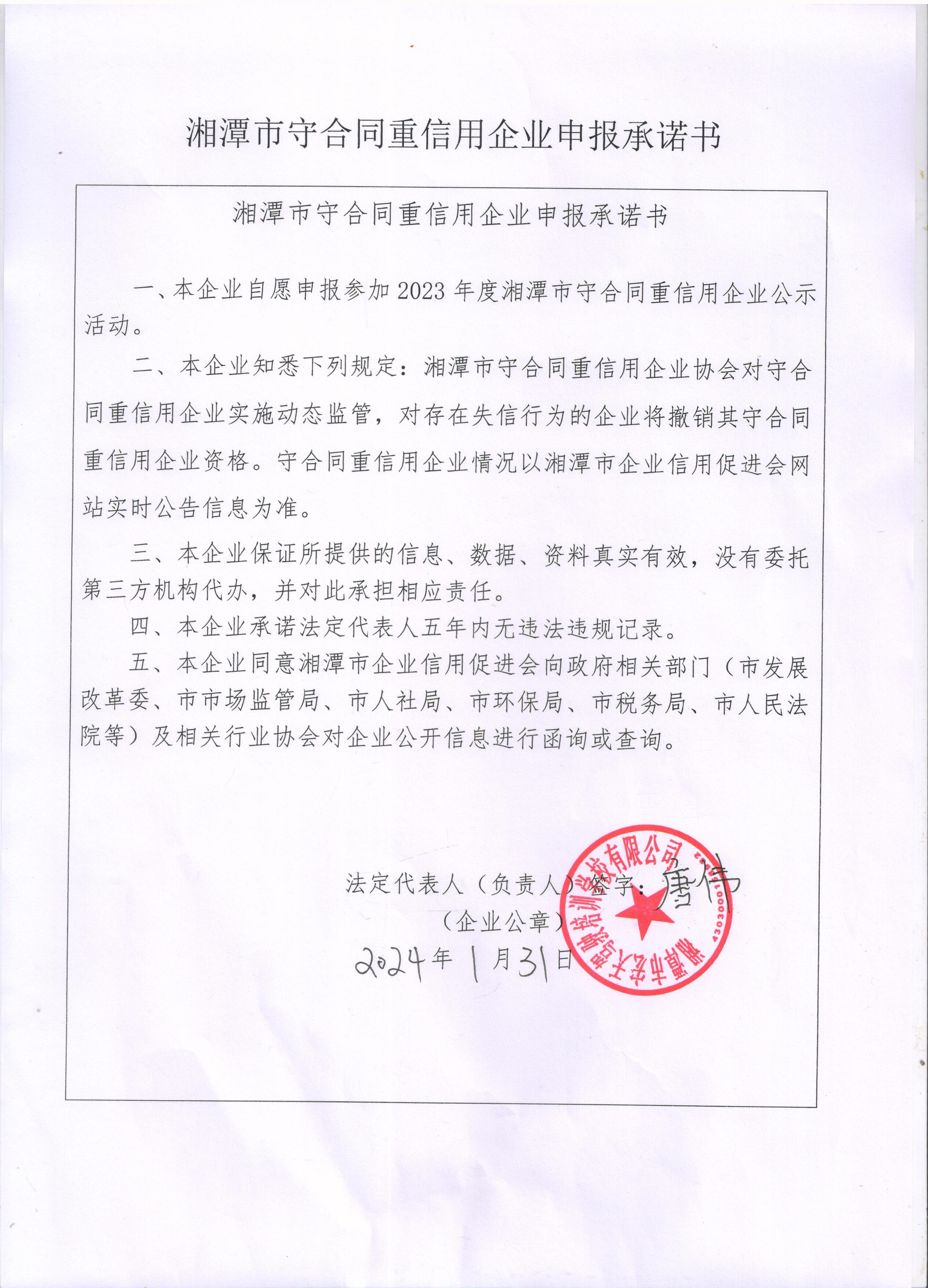 本企業(yè)根據(jù)《湘潭市守合同重信用企業(yè)申報規(guī)定》等編制 2023 年度企業(yè)信用報告書,并保證本報告書內(nèi)容真實、準(zhǔn)確、完整。