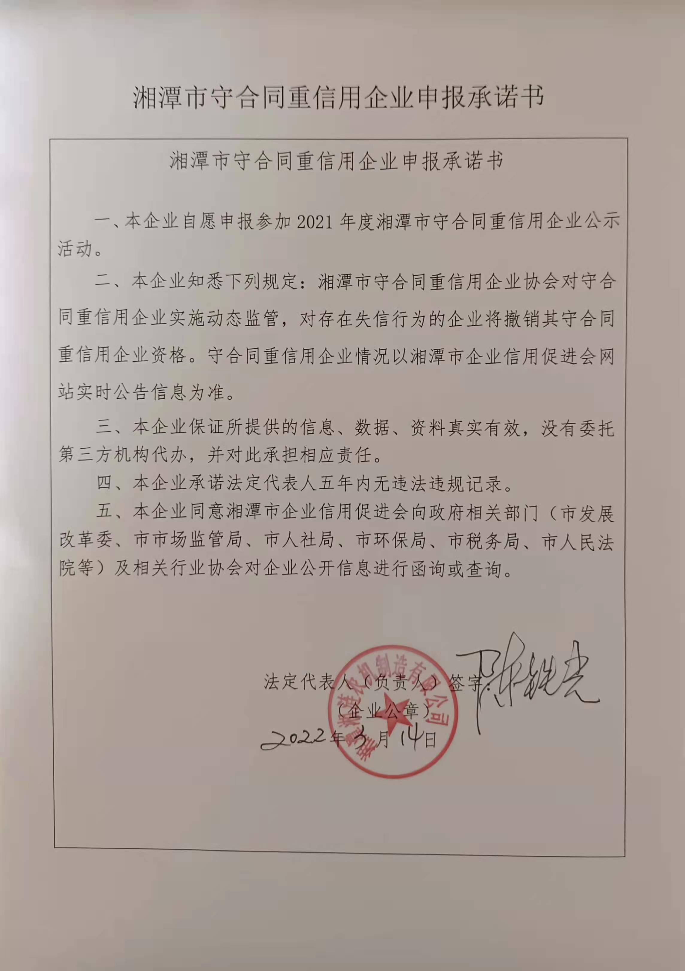 本企業(yè)根據(jù)《湘潭市守合同重信用企業(yè)申報規(guī)定》等編制 2021 年度企業(yè)信用報告書,并保證本報告書內(nèi)容真實、準確、完整。